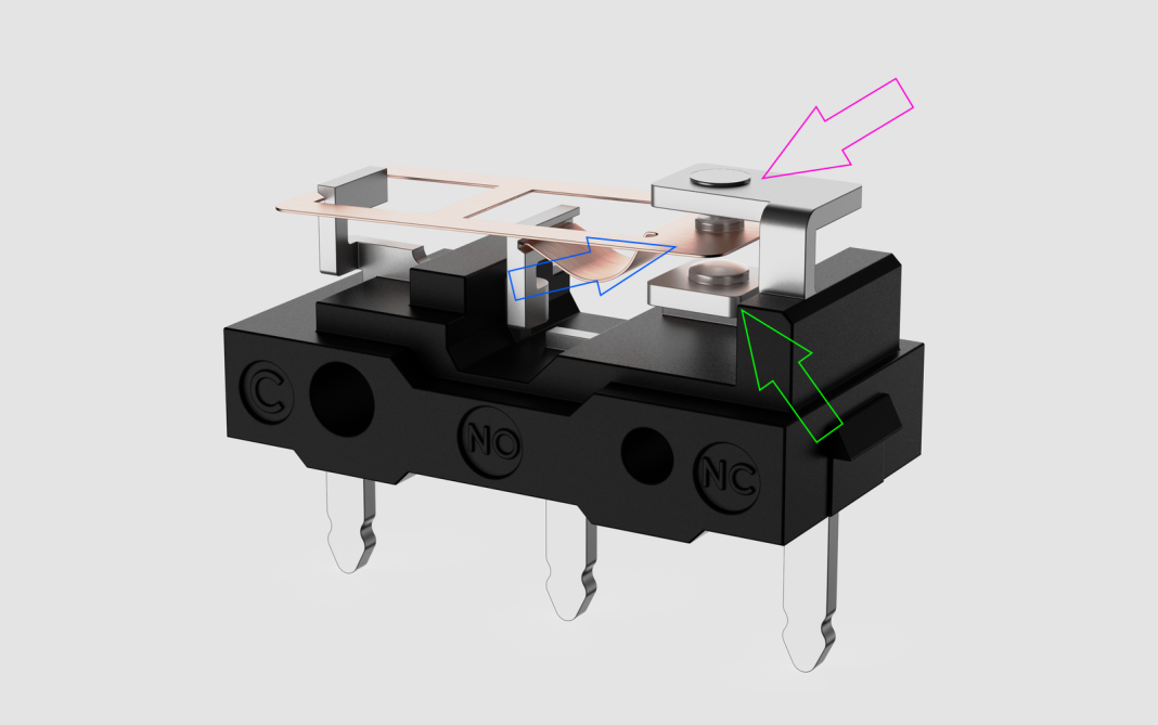 Beim Klick bewegt sich die Blattfeder nach unten, und das Schrapnell (blau) stellt den Kontakt mit dem unteren Kontaktpunkt (grün) her. Es entsteht ein Kontakt, und der Klick wird registriert. Dies ist die klassische Funktionsweise der meisten Mausschalter.